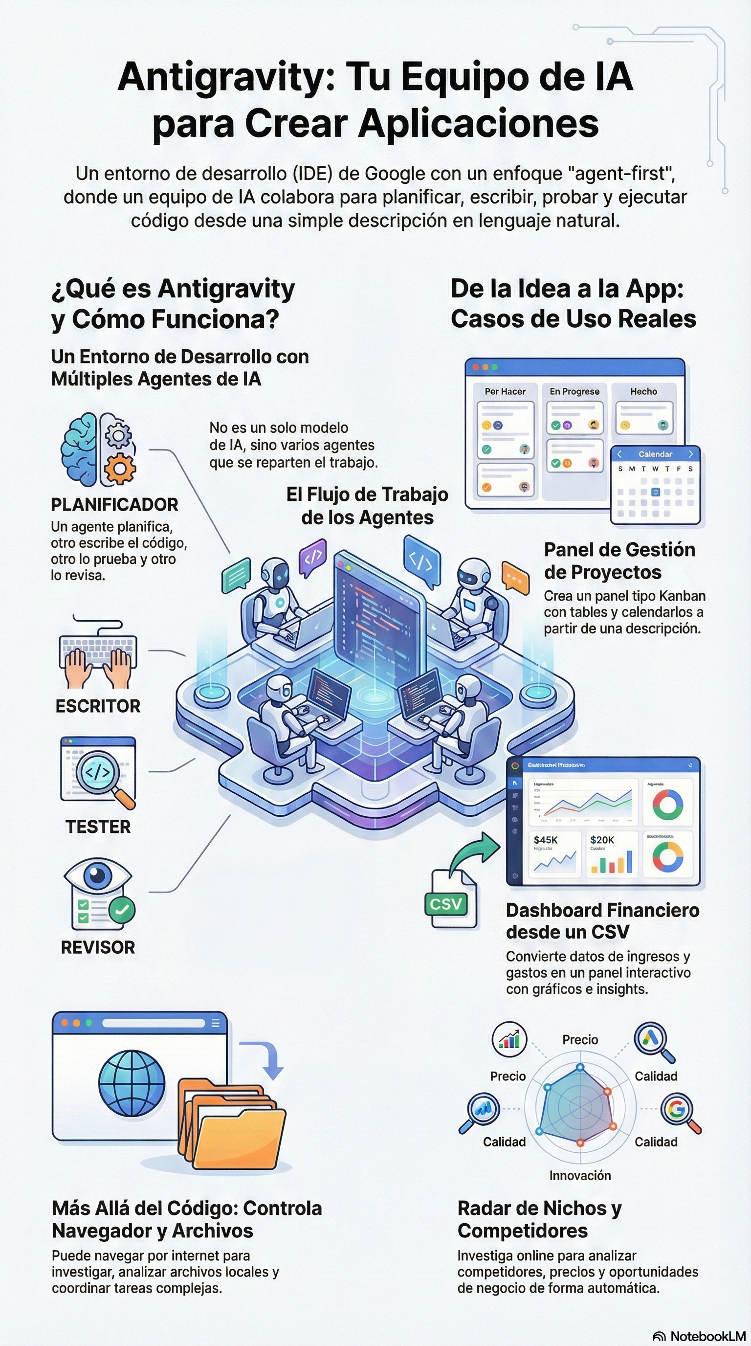 No pienses en Antigravity como un simple “autocompletado de código”. Está diseñado para permitir que agentes gestionen flujos de trabajo completos, desde diseño hasta pruebas, mejorando eficiencia y reduciendo cargas repetitivas. (Wikipedia)